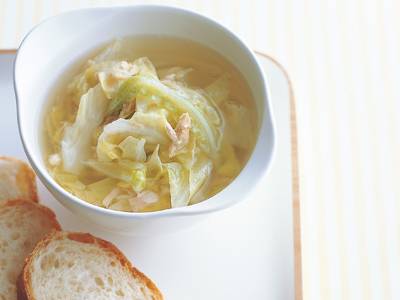 鍋に水カップ2+1/2、固形スープの素を入れ、中火にかける。煮立ったら、キャベツを加えて弱火にし、2~3分間煮る。ツナを缶汁ごと加えて混ぜ、さらに3~4分間煮る。