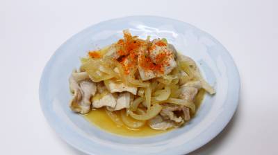鍋にめんつゆ、水カップ3/4、たまねぎ、しょうがを入れて強火で煮立て、中火にして2~3分間煮る。豚肉を加えて、さらに3~4分間煮る。器に盛り、七味とうがらしをふる。