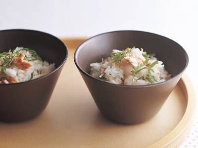 大きめのボウルにご飯を入れ、あじ、青じそ、しょうが、白ごまを加えて、しゃもじでサックリと混ぜる。