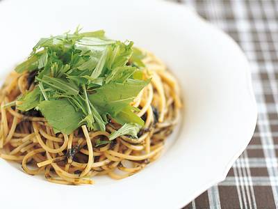 パスタがゆで上がったらざるに上げ、水けをきる。フライパンにパスタ、2ののりのつくだ煮を入れ、菜ばしでよくあえる。器に盛り、水菜をのせる。