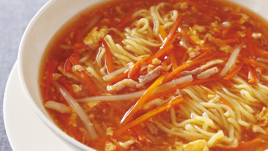 とろみをつけた、酸っぱくて辛いスープを麺にからめながらいただきましょう。酢は酸味がとばないように、最後に加えるのがポイント。
