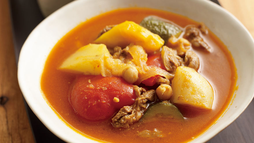 じゃがいも以外の野菜を加え、弱火で15~20分間煮る。仕上げにじゃがいもと、ひよこ豆を加え、味をみて塩・こしょう各少々をふり、2~3分間煮る。器に盛り、ご飯を添える。