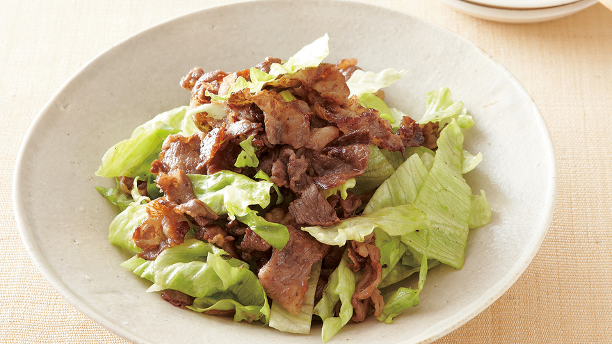 シャキシャキのレタスに、炒めた牛肉のうまみをからめるように混ぜるのがポイント。ボリュームたっぷりのおかずサラダです。