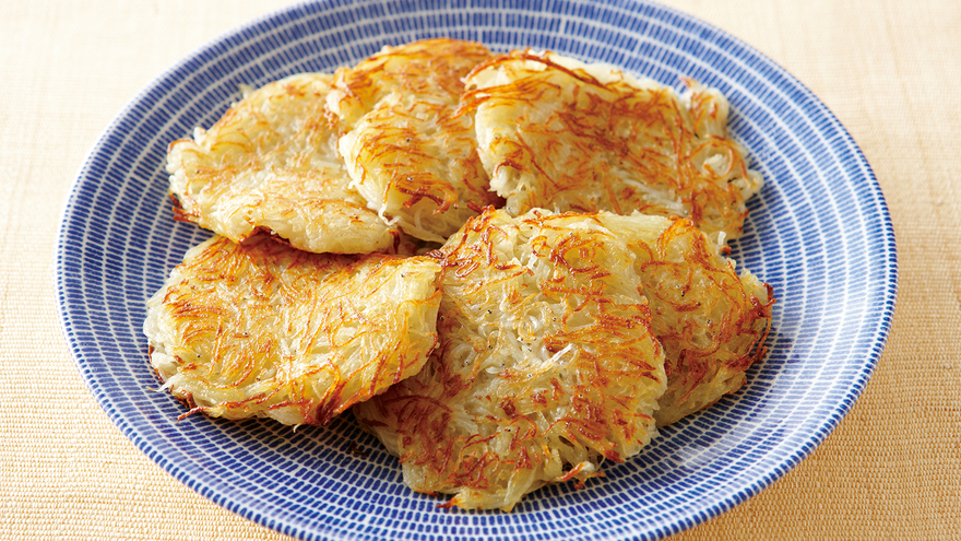 フライパンにオリーブ油大さじ2を中火で熱し、2を直径5~6cmの薄い円形にまとめて並べ入れる。3~4分間焼いたら返し、オリーブ油大さじ1を縁に沿って回し入れ、表面がカリッとするまで約3分間焼く。