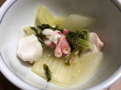 ざるごと水につけ、菜箸で混ぜる。水をかえてもう一度つけ、混ぜて冷ます。ざるを引き上げ、上下に大きく振ってしっかりと水けをきる。