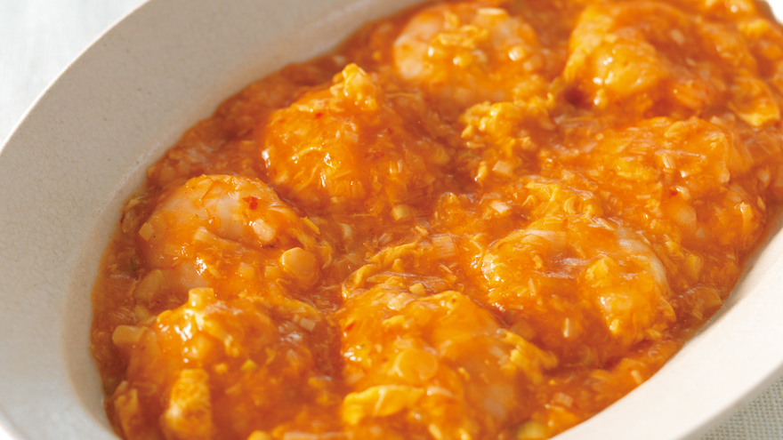 辛くて甘酸っぱいチリソースを、プリプリのえびにたっぷりからめます。溶き卵を最後に回し入れて、まろやかな味わいに。