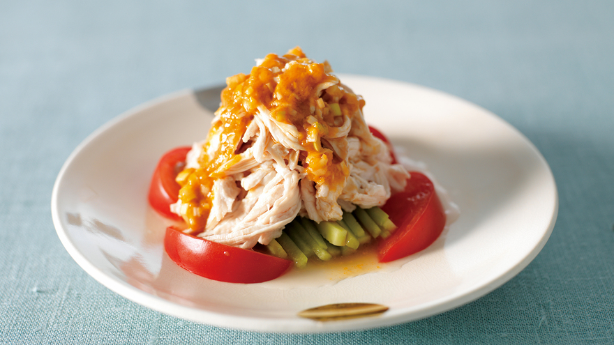 きゅうりは皮むき器で皮をむき、長さを半分に切ってせん切りにする。トマトはくし形に切る。器にきゅうりとトマトを盛り、【ゆで鶏】をのせて4のたれをかける。