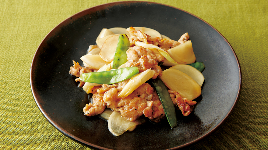 豚肉に【A】の材料を加えて、軽くもみ込み、かたくり粉を加えて混ぜる。ねぎは1cm幅の斜め薄切りにする。かぶは皮付きのまま縦半分に切ってから薄切り(半月切り)にする。たまねぎは一口大に切る。絹さやはヘタと筋を除く。【黒酢だれ】の材料は混ぜ合わせる。