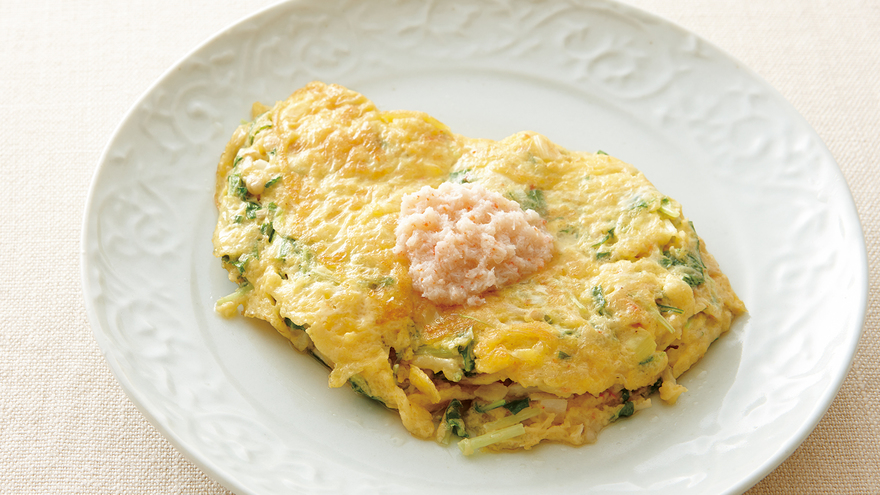 ほぐし身タイプのお手ごろなかに缶でも、大満足のごちそうに変身します。水菜、えのきだけの歯ごたえとふんわり卵のコントラストが絶妙な一品。