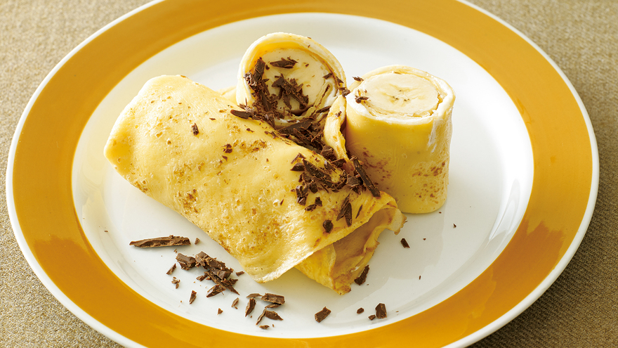 生地は材料を混ぜ合わせるだけ。薄く流し、返すコツをマスターすれば、ビギナーにも簡単!バナナを巻けば、すてきなスイーツに変身します。