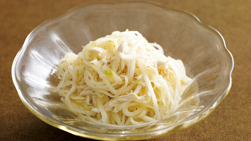 大根と鶏ささ身の白さを生かしたサラダです。わさびの辛みとゆで汁のうまみで、味わい深い一品。