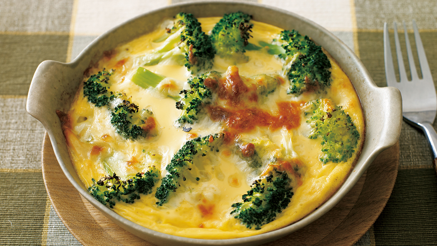 堅めにゆでたブロッコリーに卵液を注いで焼くだけ。溶けたチーズでコクとうまみも満点です。