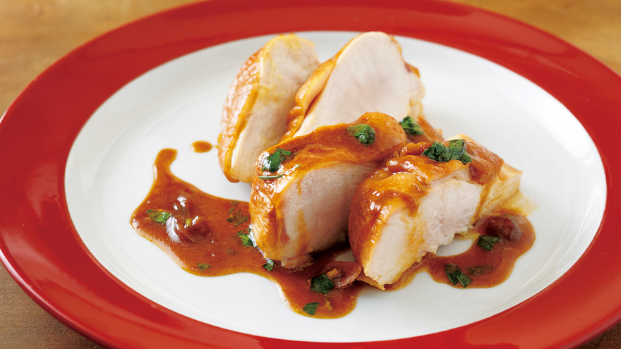 果汁につけ込んでから弱火でじっくり焼くと、むね肉が驚きの柔らかさに。ソースの味がしみ込んだ皮も絶品です。