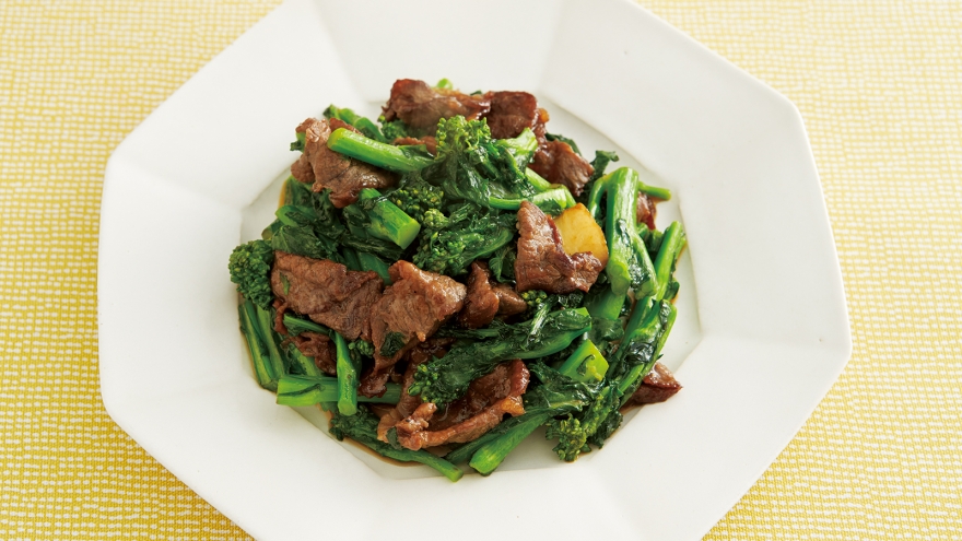 甘辛味の牛肉に菜の花のほろ苦さがよく合う炒めものです。菜の花は炒めたあと、いったん取り出して、色と食感を生かします。