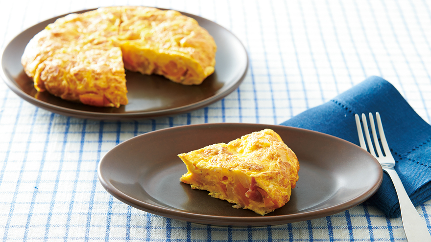 フライパンいっぱいに流して円形に焼く、具だくさんのオムレツ。パプリカの甘みと食感がよいアクセントになります。