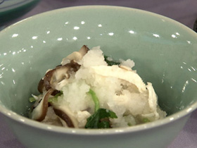【調味料】とだしを混ぜ、ささみ、しいたけ、三つ葉、おろし大根を混ぜる。
