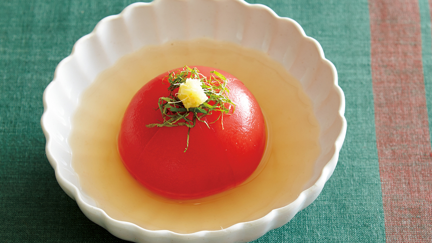 トマトは皮をむいて味をしみ込みやすくし、味つけしただしに浸します。うまみたっぷりのトマトの魅力を満喫しましょう。