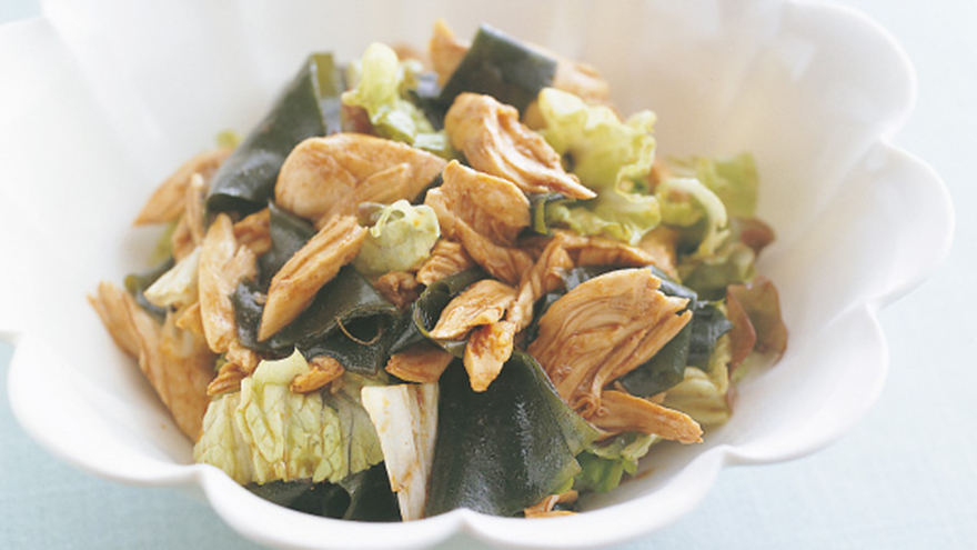 ボウルに【調味料】の材料を入れて混ぜ、ささ身、わかめを加えてよくあえる。サニーレタスを加えてサッと混ぜ合わせる。