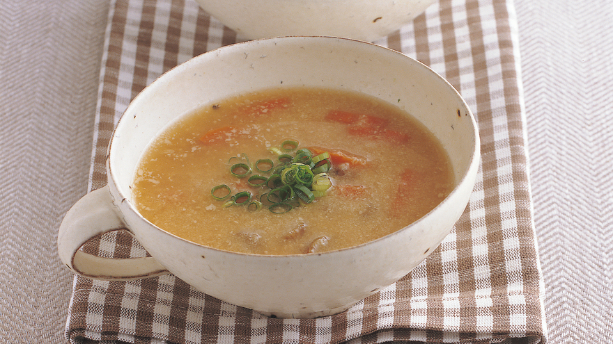 食物繊維たっぷりのスープです。根菜のうまみと、みその香り、おからの食感がベストマッチ。