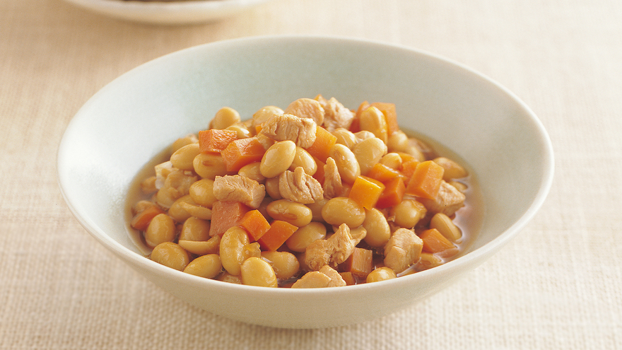 ふっくらおいしい煮豆。大豆に鶏肉と野菜のうまみが、じんわりしみています。