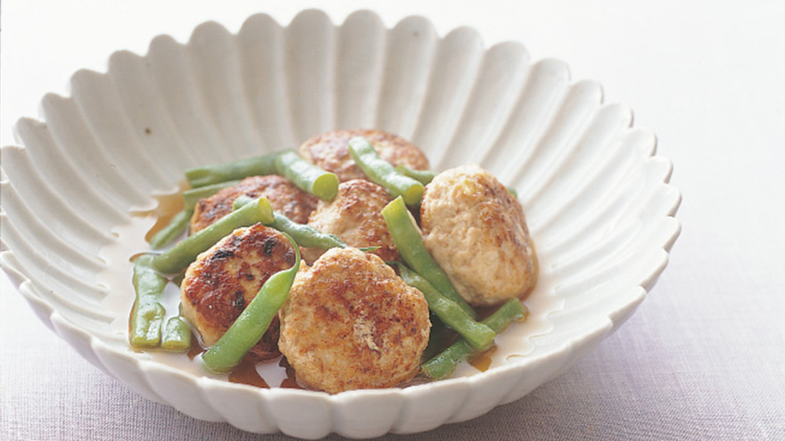 鍋に【煮汁】の材料を入れて中火で煮立て、つくねを加える。再び煮立ったらいんげんを加え、ふたをせずに中火のまま約5分間煮る。いんげんがしんなりとしたら器に盛り、残った【煮汁】をかける。