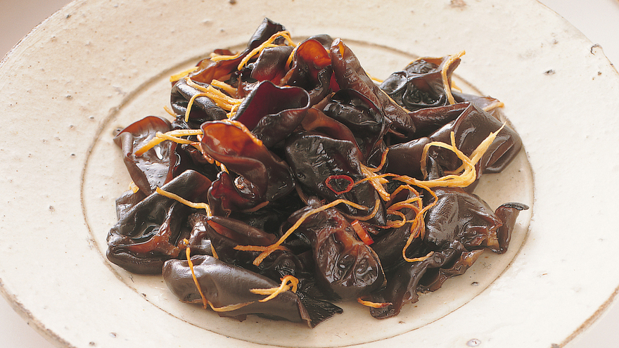 フライパンにごま油を弱火で熱し、しょうが、赤とうがらしを入れて炒める。香りがたったら中火にし、きくらげを加えて炒め合わせる。全体に油が回ったら、酒・しょうゆ・酢を加え、手早く混ぜる。