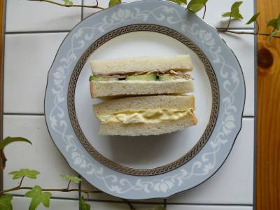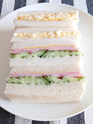食パンの片面に3のマスタード入りバターを等分にぬる。食パン2枚にハム、きゅうりを等分にのせてマヨネーズを小さじ1/2ずつぬり、マスタード入りバターをぬった面が下になるように、食パンを1枚ずつ重ねてはさむ。食パン2枚に3のゆで卵を等分にのせて広げ、同様に食パンを1枚ずつ重ねてはさむ。1人分ずつラップで包み、重ねて約10分間おく。途中、上下を返す。横半分に切り、ラップを外して器に盛る。