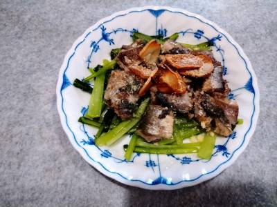 フッ素樹脂加工のフライパンにオリーブ油小さじ2、にんにくを入れて弱火できつね色になるまでいためて取り出す(後で使うのでとっておく)。いわしを入れて両面を焼き、片側に寄せてタアサイを入れていためる。塩・こしょう各少々をタアサイに、白ワインを全体にふる。