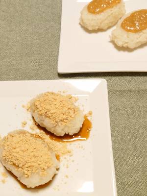 直径24cmのフッ素樹脂加工のフライパンを中火にかけ、約30秒間熱する。4を入れて弱火にし、約3分間焼いて裏返し、さらに約3分間焼く。両面に焼き色がついたら、器に盛る。2コは5のごまみそを等分にのせてぬり、残りの2コは黒みつ、きな粉を順に等分にかける。