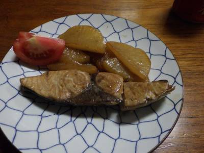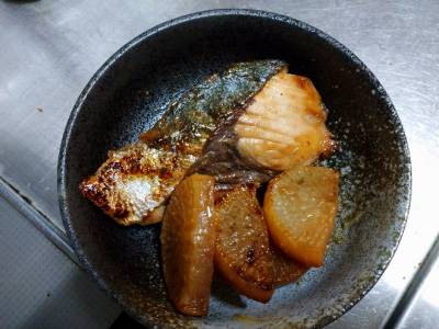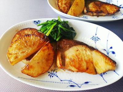 ぶりは、ペーパータオルで軽く押さえるように汁けをふく。フライパンにサラダ油を強火で熱し、ぶりの皮の面を下にして並べ入れ、あいたところに大根を入れる。約10秒間焼いて弱火にし、約2分間焼く。ぶりと大根を裏返して強火にし、約10秒間焼いて弱火にし、さらに約2分間焼く。