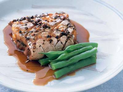 たちうおは背ビレがついていたら、上下から斜めに切り込みを入れてはずす。皮めに約1cm間隔に斜め格子状の切り目を入れる。粒こしょうはふきんなどで包み、上からたたいてつぶす。