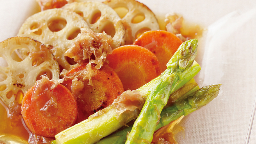ごま油で香ばしく焼いた野菜を削り節入りの漬け汁に漬けるだけ。和風味がじんわりしみ込みます!