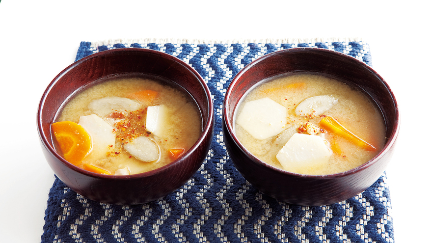 おなじみの根菜、ごぼう、里芋、にんじんにベーコンをプラスした、アイデアみそ汁です。煮汁にそれぞれのうまみがしみていて、仕上がりは極上です。