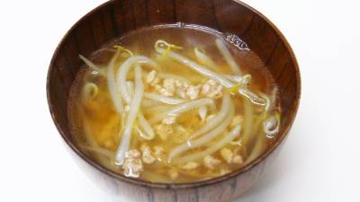 全体に油が回ったら、酒をふって全体を大きく混ぜ、水カップ2+1/2、顆粒チキンスープの素を加える。煮立ったら、弱火にしておたまでアクを取り除き、ふたをせずに2~3分間煮る。もやしがしんなりとしたら、【調味料】の材料を加えて混ぜ、サッと煮る。