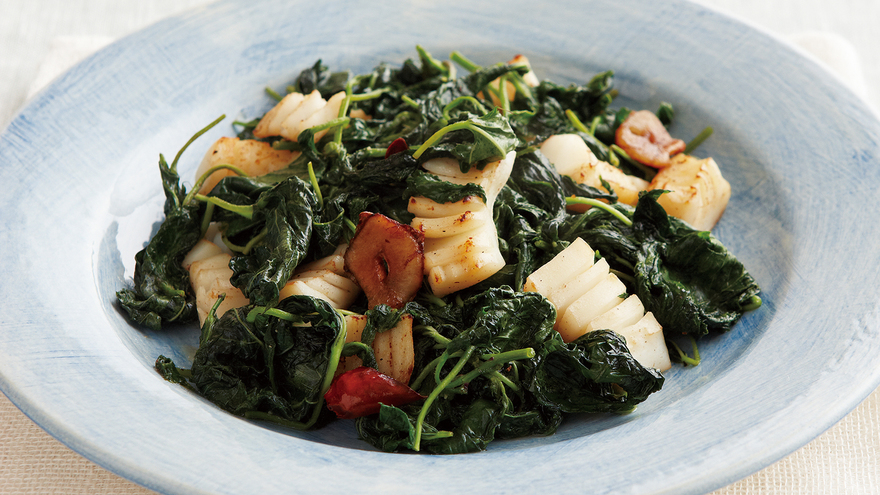 いかがプリッとしたらモロヘイヤを加え、サッと炒め合わせて。
