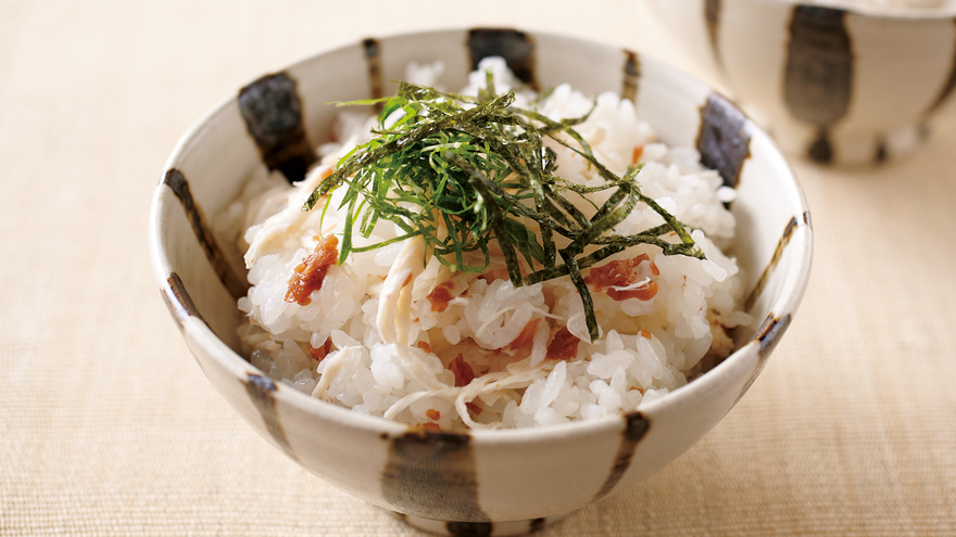 おいしいご飯(炊飯器)の1~4を参照して米を炊く。炊き上がったら、ご飯の上に1の具をのせ、ふたをして10分間蒸らし、しゃもじでふんわりとやさしく混ぜる。茶碗(わん)に盛り、青じそと刻みのりをのせる。