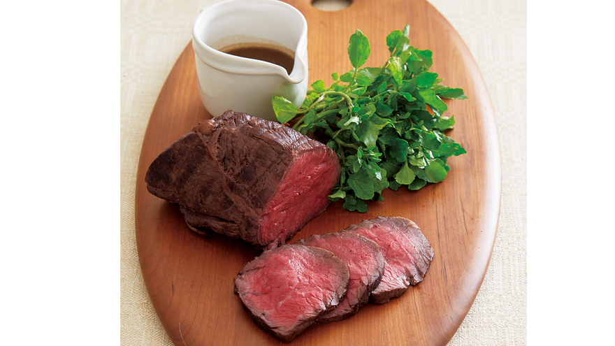 アルミ箔(はく)を広げ、4の牛肉をのせて包み、ポリ袋に入れる。さらに布巾などで包み、約1時間おく。アルミ箔や布巾で保温しながらしばらくおくと、余熱で中までじんわり温まり、肉汁の流出が少なくなってしっとり仕上がる。