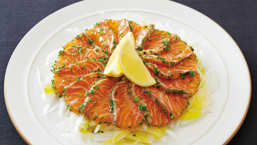 たまねぎは繊維に沿って薄切りにし、冷水に約5分間さらしてパリッとさせ、ざるに上げて水けをよくきる。2をハーブが付いたまま5~6mm厚さに切る。器にたまねぎを敷いてさけを盛り、レモンをのせてオリーブ油をふる。