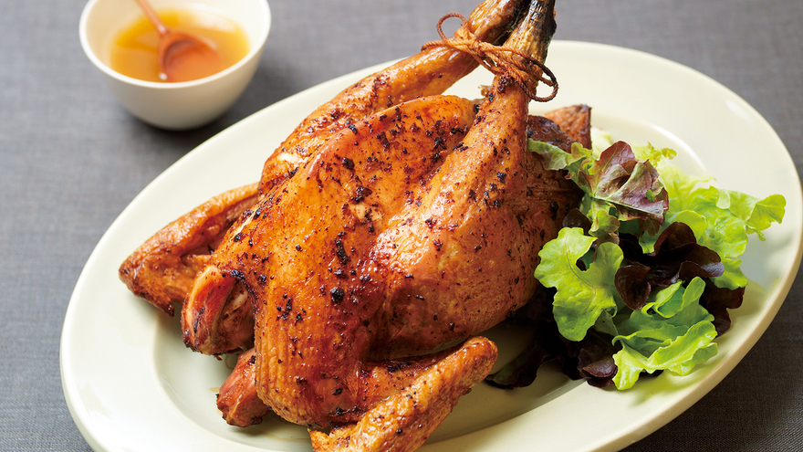 オーブンを220℃に温めておく。肉汁を受ける天板と焼き網を重ねて鶏をのせ、オーブンで10分間焼く。温度を180℃に下げ、さらに約1時間焼く。焼いている間は15分ごとに取り出して別の天板にのせ、天板にたまった肉汁を鶏全体にかける。