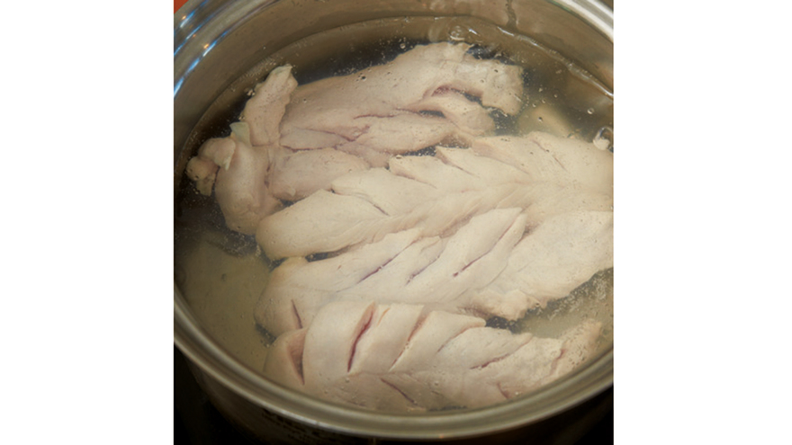 鍋に湯を沸かし、ささ身を入れる。中火で8分間ゆで、ささ身を取り出す。