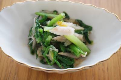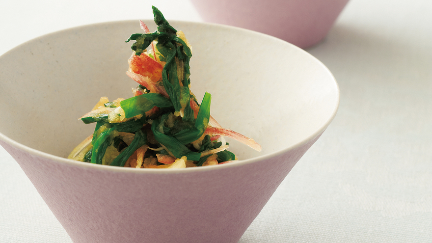 にらは3cm長さに切る。鍋に湯を沸かして塩少々を入れ、にらを入れる。再び沸騰してから30秒間ほどゆで、手早く氷水にとって冷やし、水けを絞る。みょうがは縦半分に切ってから斜め薄切りにする。