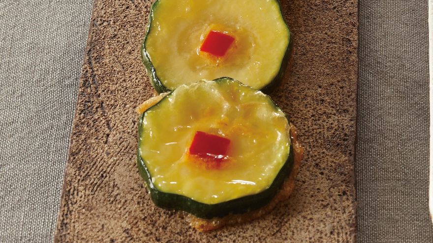 ズッキーニは7~8mm厚さの輪切りにし、塩少々をふって5分間ほどおく。表面の水けをしっかりと拭き取り、小麦粉を茶こしなどで薄くつける。飾り用の赤ピーマンは3mm四方に切る。
