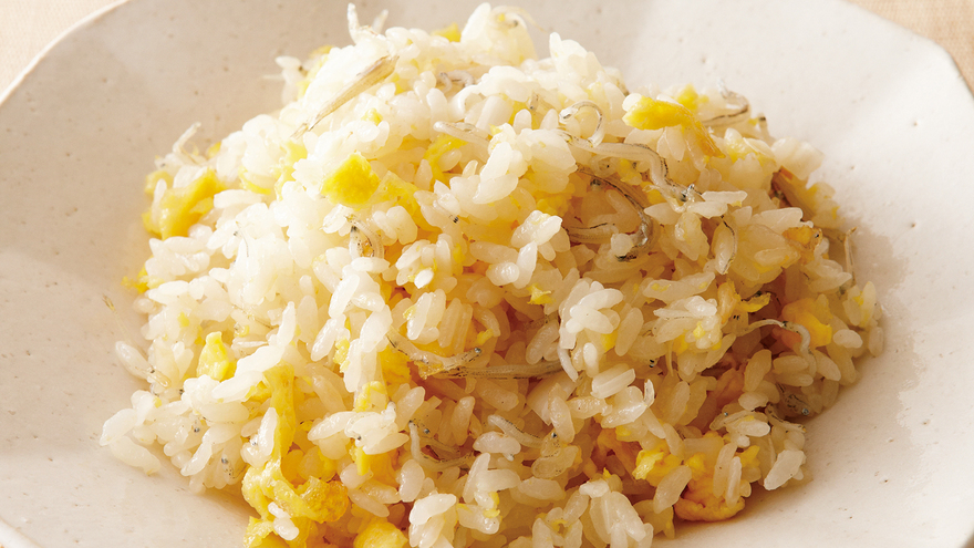 ご飯がよくほぐれて卵と混ざったら、ちりめんじゃこを加えて炒める。