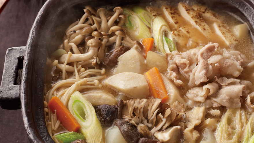 東北の広い地方で食べられているのが、この豚汁風芋煮。豚肉のコクとみそ味で体も心も温まり、ホッとなごみます。みそを加えたらアクを取りながら、静かに煮るのがポイント。