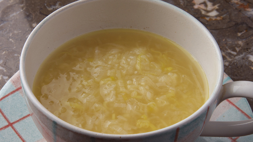 ぽってりとした、ペースト状になれば、ねぎのヴルーテの完成。1人分はヴルーテ約大さじ1をティーカップに入れ、熱湯カップ3/4~1を注ぐ。塩少々で味を調える。