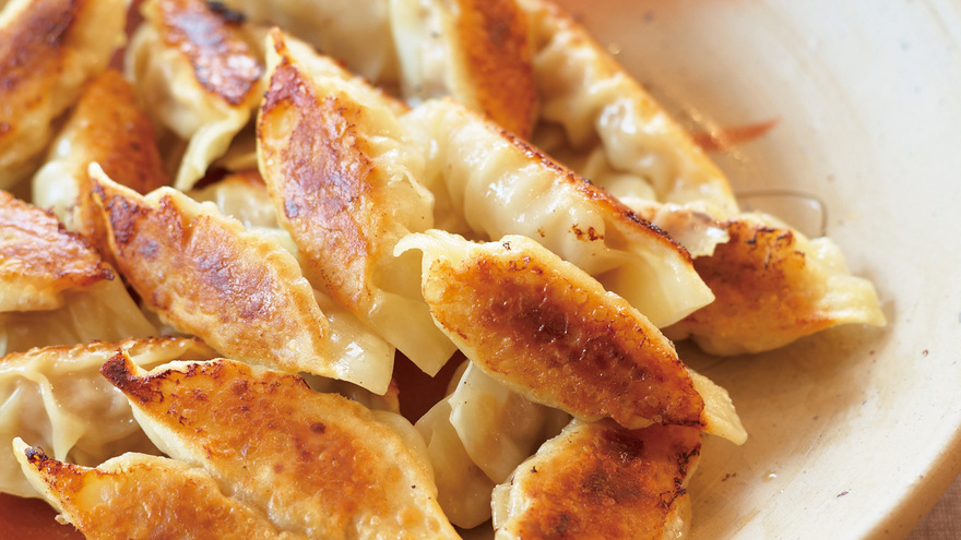 水分がとび、ギョーザの皮に透明感が出て、皮の縁の部分がピンと立ったら、ごま油適量を香りづけにふり入れ、器に盛る。