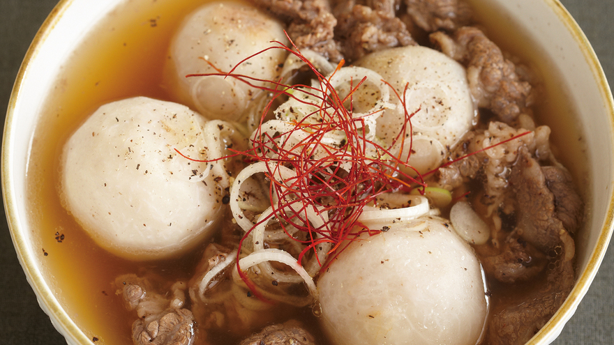里芋を加え、再び煮立ったらアクを取り、弱火にして20~30分間煮る。里芋が柔らかくなったら、しょうゆ大さじ1/2を加えて軽く煮る。塩・黒こしょう各少々で味を調え、器に盛る。ねぎ、糸とうがらしをのせ、黒こしょう適量をふる。