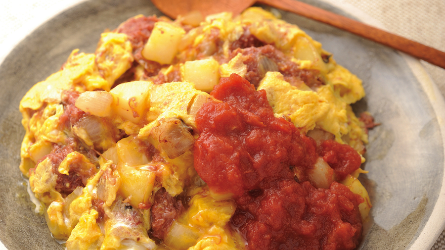 じゃがいもと卵をふんわり炒め、即席トマトソースをかけていただきます。コンビーフが入ると、余分な味つけなしでも味が決まりますよ!お弁当にもぴったり。