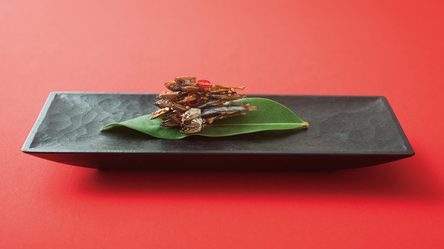 ごまめは苦みのある腹ワタを丁寧に取る。赤とうがらしはヘタを切って種を抜き、湯につけ、柔らかくなったら輪切りにする。