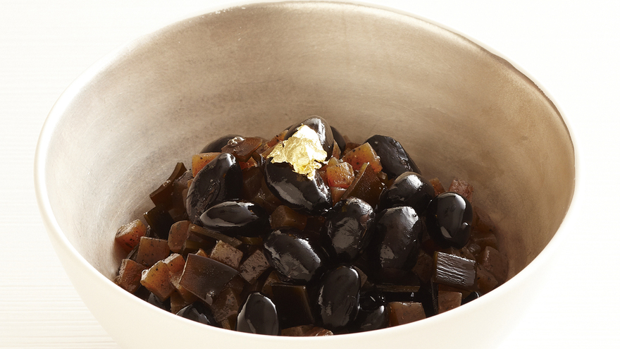 1のこんにゃくと【A】を加え、落としぶたをして10~12分間煮る。黒豆を加えて、揺すりながら煮汁がなくなるまで煮る。熱いうちにラム酒を加えてサッと混ぜ、器に盛る。あわば金箔を飾る。